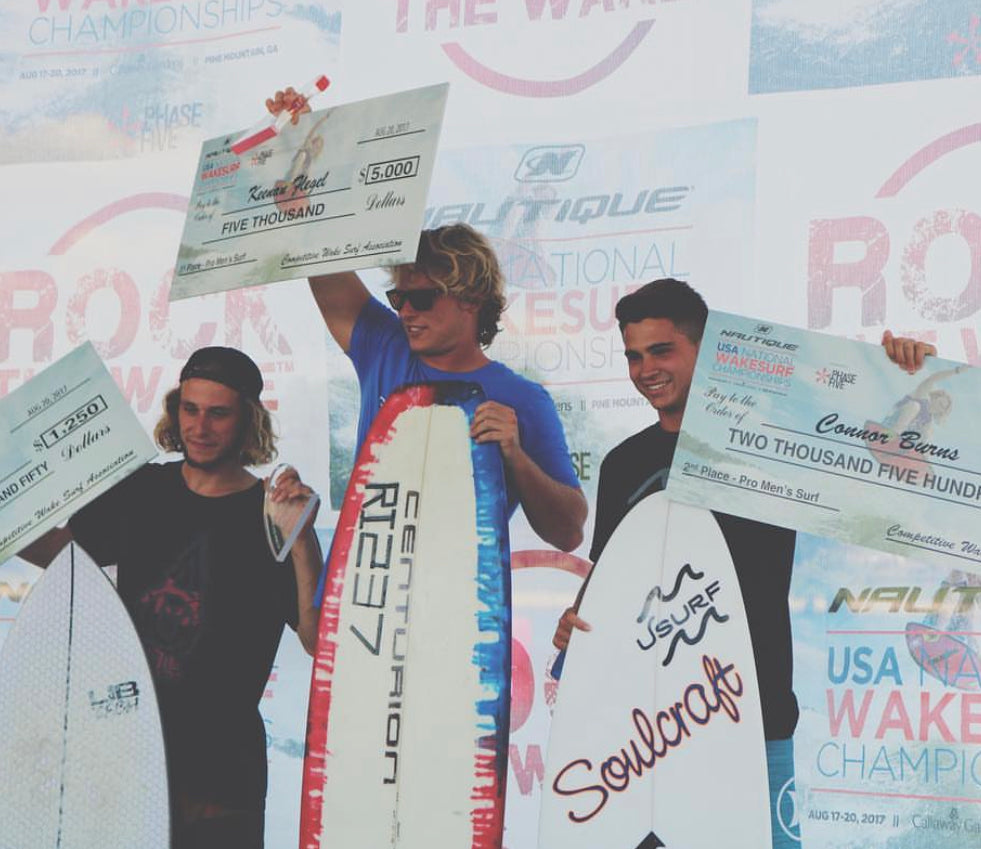 Hey! My name is Connor Burns! I’m 23 years old and I’ve been wakesurfing since the summer of 2016. Our friend had a wakesurf boat and I just loved it so much we ended up getting our own boat at Scorpion bay marina. I started competing almost immediately and won the Amateur World Championships my first year, then moved straight to pro. I just won the professional world championships for the 5th year! I love the sport and honestly couldn’t imagine my life without it. My sponsors are Centurion/Supreme Boats and Kanuk Board Co. I ride the 4’5 Burnsy Pro and I am proud to say it is Kanuk's best seller! My goal is to do the best I can promoting the industry and sharing my love for the sport. Read below for my podium history!